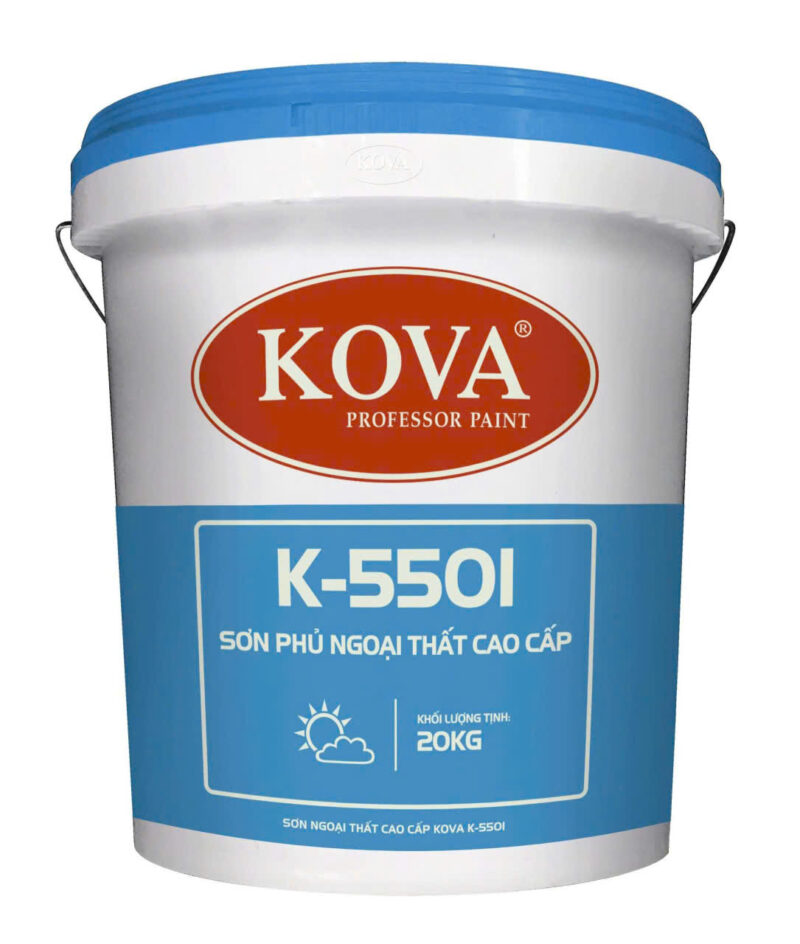 Sơn ngoại thất cao cấp KOVA K-5501 là loại sơn cao cấp hệ Pure Acrylic phủ ngoại thất, đã hoàn toàn nhiệt đới hóa, rất phù hợp với khí hậu nóng ẩm của Việt Nam. Dùng để chống thấm và trang trí ngoại thất của tường bê tông, vữa, xi măng sau khi đã dùng mastic dẻo, bột trét để làm phẳng và được phủ sơn lót ngoại thất kháng kiềm, hoặc thi công trực tiếp lên CT-11A Plus Tường.