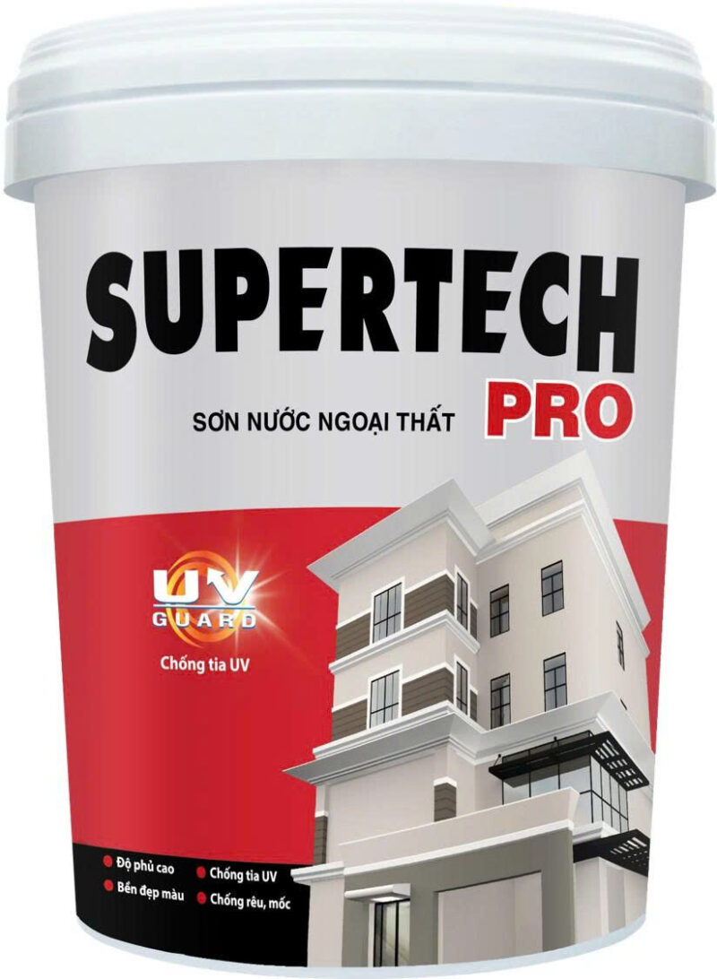 Sơn nước ngoại thất Supertech Pro được sản xuất từ nhựa acrylic, dùng để bảo vệ bề mặt tường ngoài trời. Bề mặt màng sơn mờ, láng mịn, có thể chịu đựng được thời tiết khắc nghiệt, chống phai màu, phấn hóa. Với ứng dụng kỹ thuật mới, sản phẩm có chất lượng tốt, độ che phủ cao, chống kiềm hóa, chống rong rêu, nấm mốc và chống tia UV. Sản phẩm không sử dụng chì, thủy ngân và phoóc-môn.