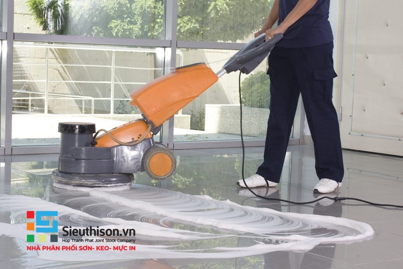 Mài sàn: Dùng máy mài công nghiệp với đĩa kim cương để loại bỏ lớp xi măng yếu, tạp chất và dầu mỡ, tạo độ nhám giúp sơn bám chắc hơn.
